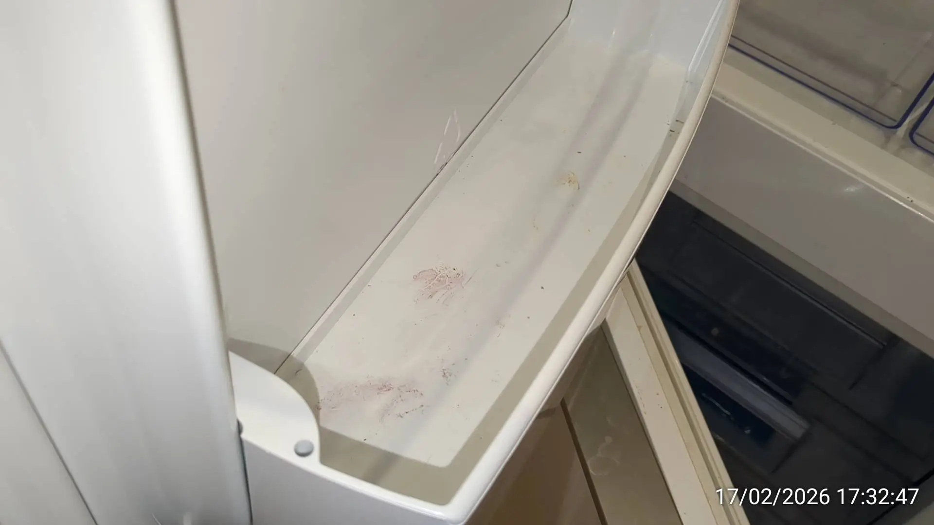 Fridge door compartment photographed during check-out, showing staining that differs from the original inventory.