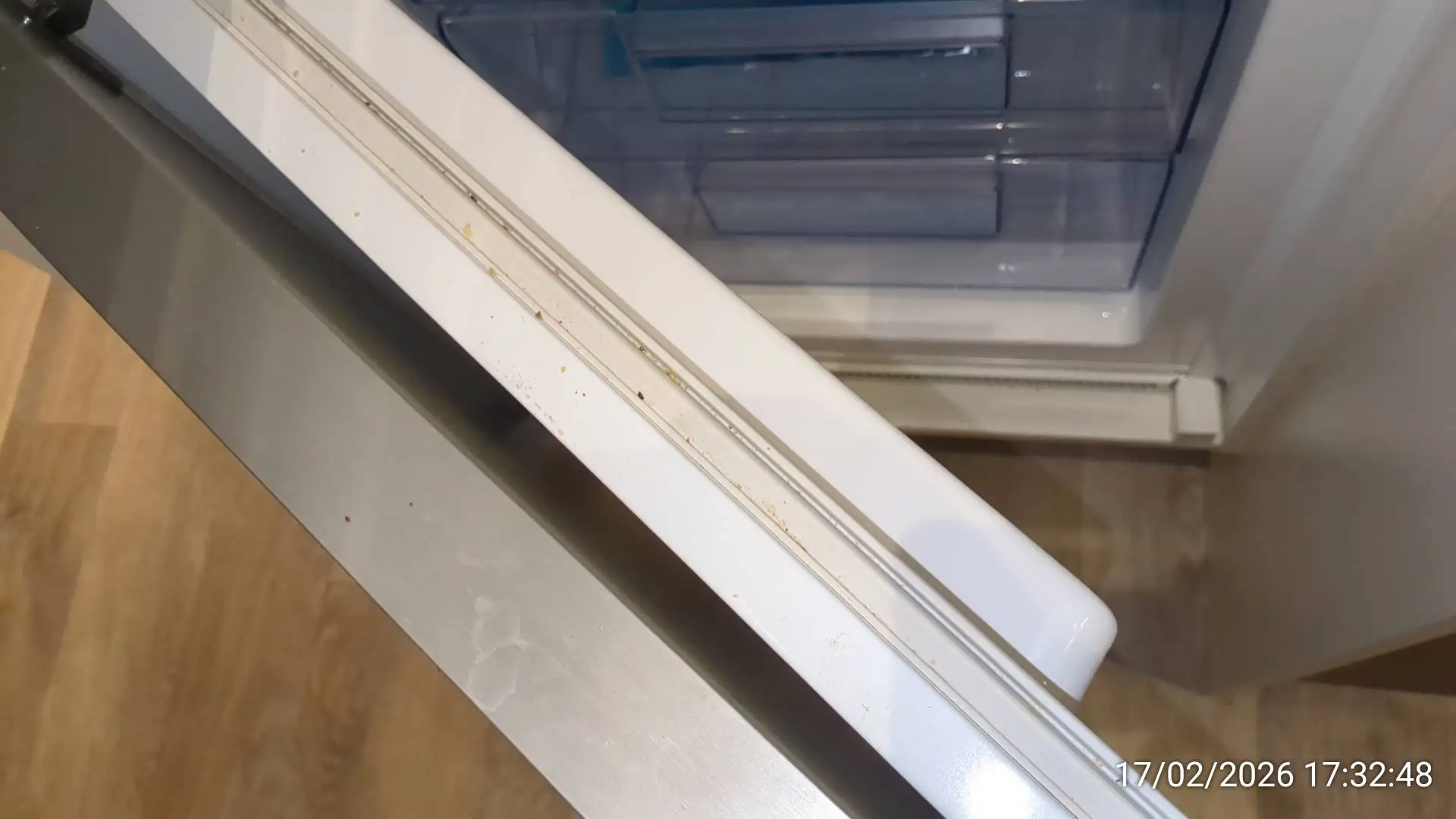 Close-up of fridge freezer door seal during check-out inspection, documenting debris accumulation.