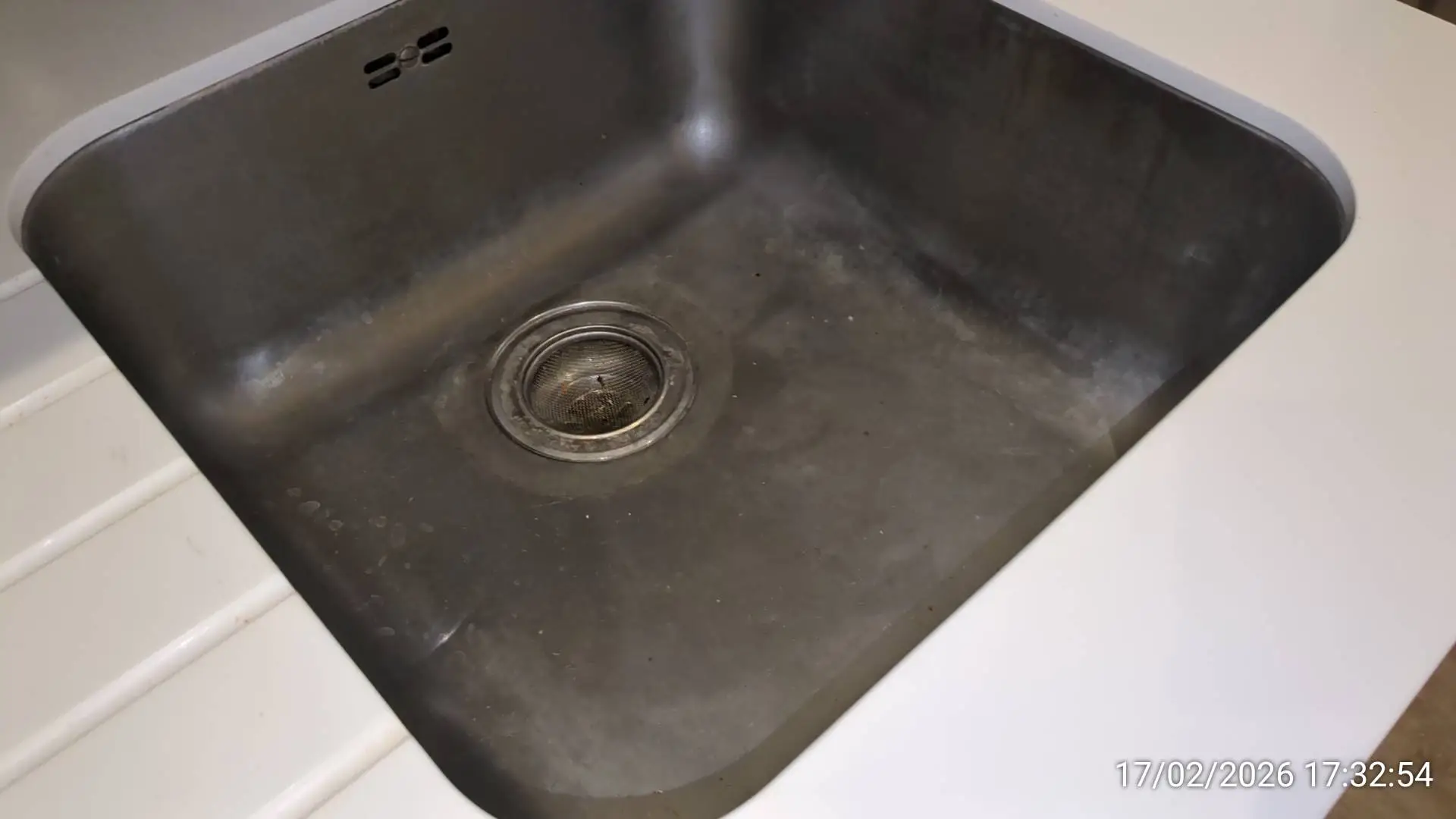 Stainless steel kitchen sink documented during check-out, noting limescale and general condition.