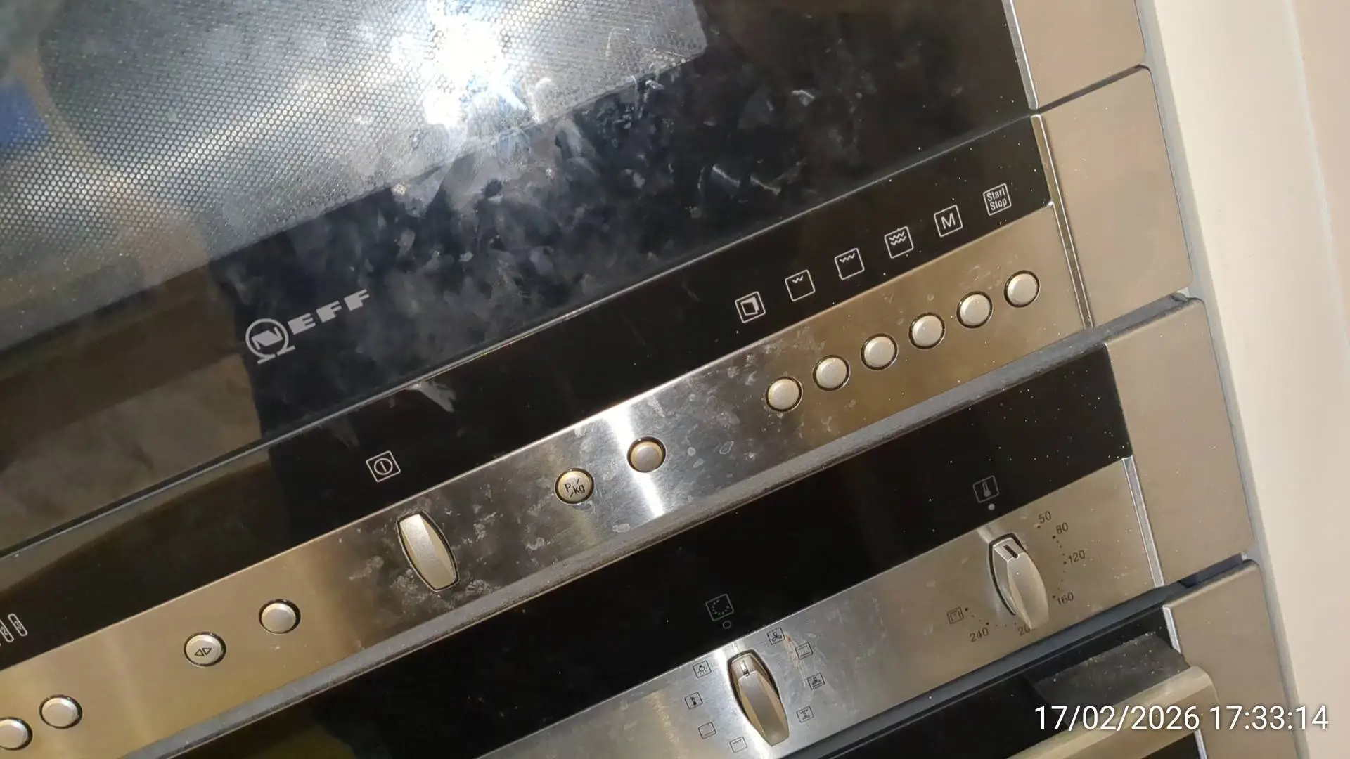 Neff oven and microwave front panels documented during check-out, noting fingerprints and surface condition.