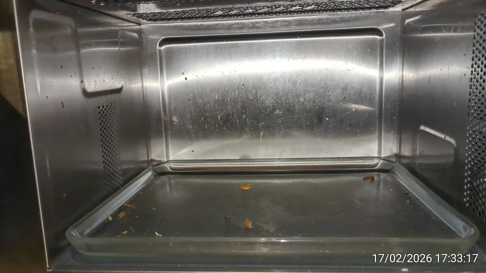 Microwave interior photographed during check-out inspection, documenting food debris and general cleanliness.