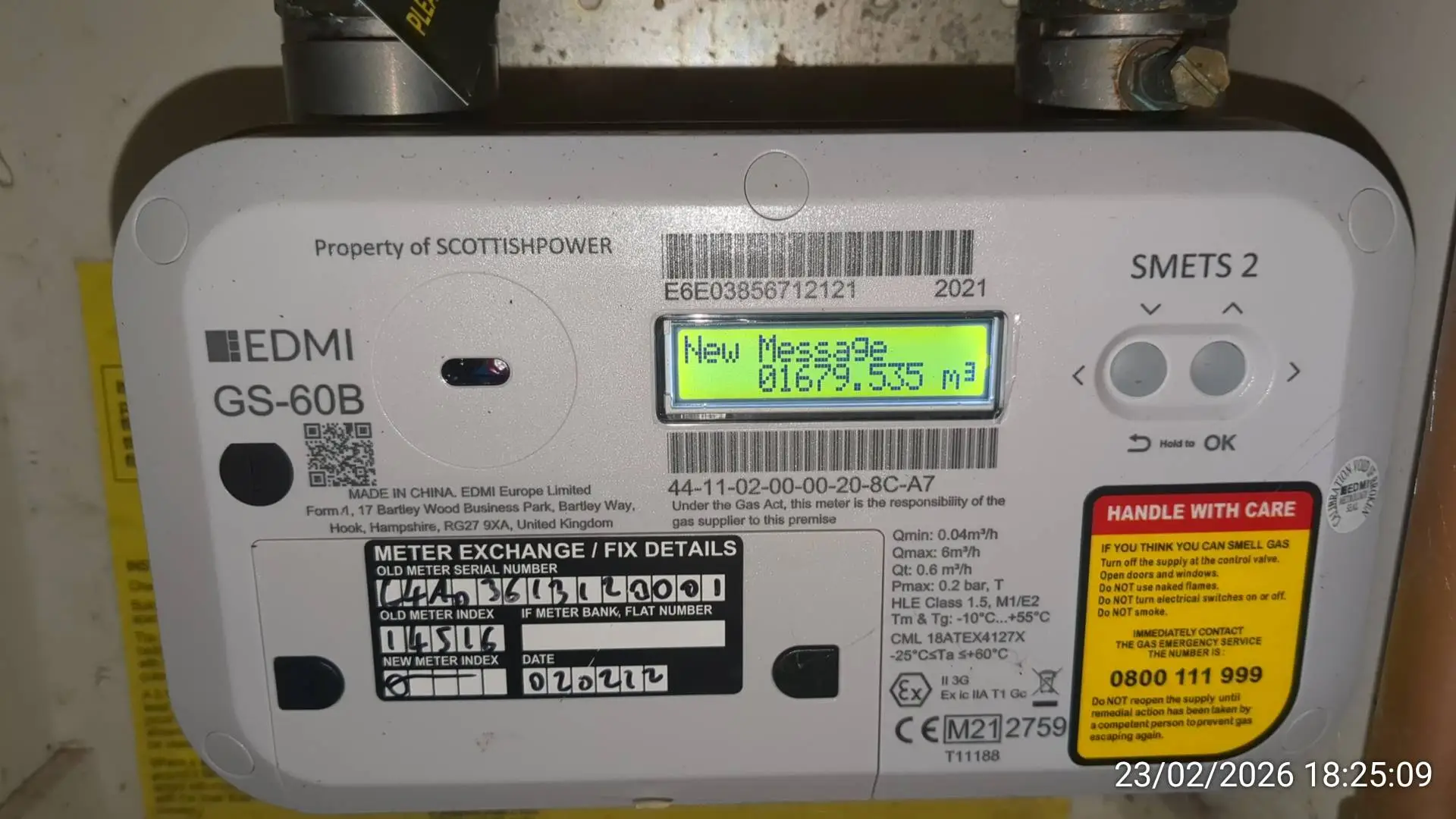 Gas meter (SMETS 2) reading documented during a property inspection — meter readings are recorded at every check-in and check-out.