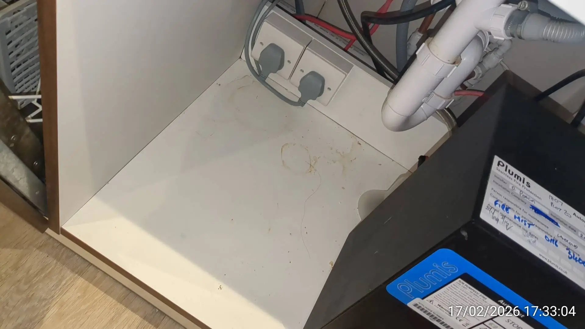Under-sink cupboard inspected during check-out, documenting plumbing connections, water filter unit, and wall condition.