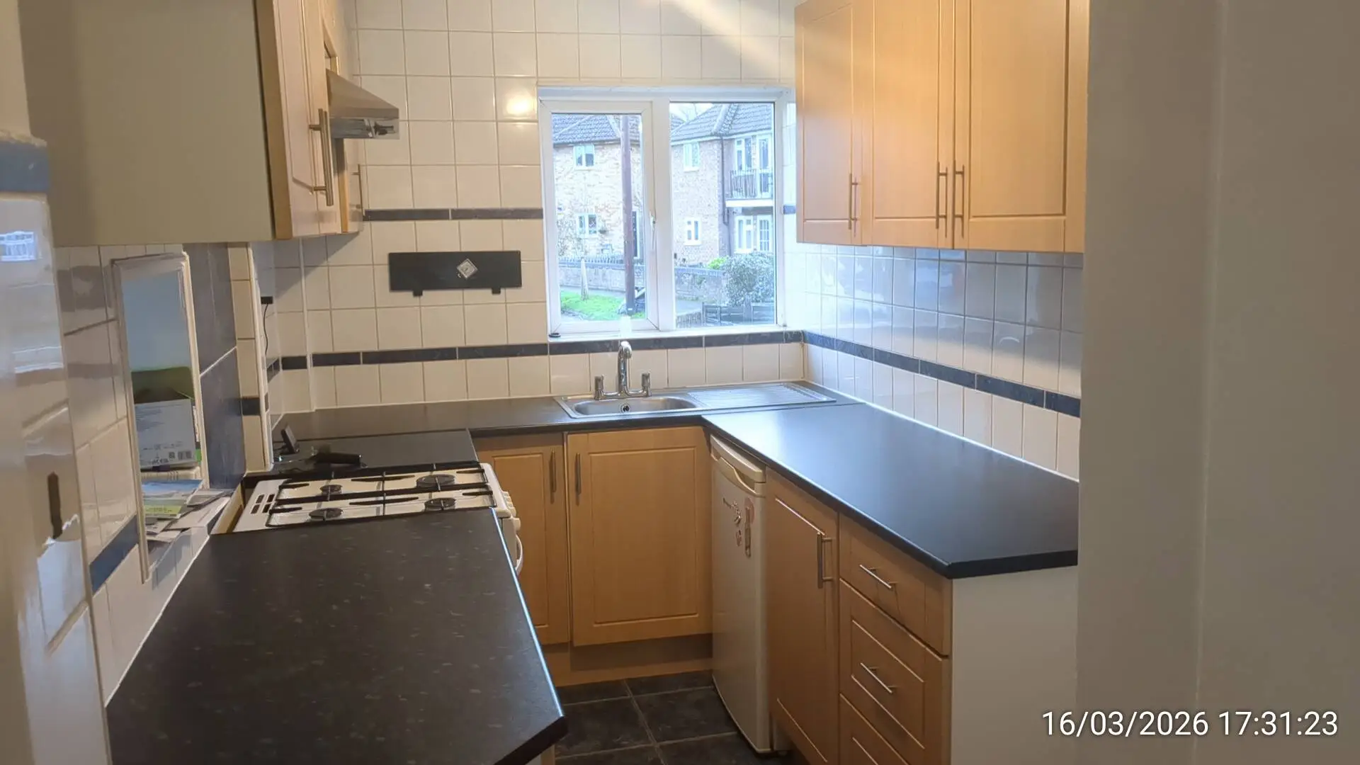 Full kitchen overview photographed during an inventory inspection, documenting layout, fittings, and general condition.