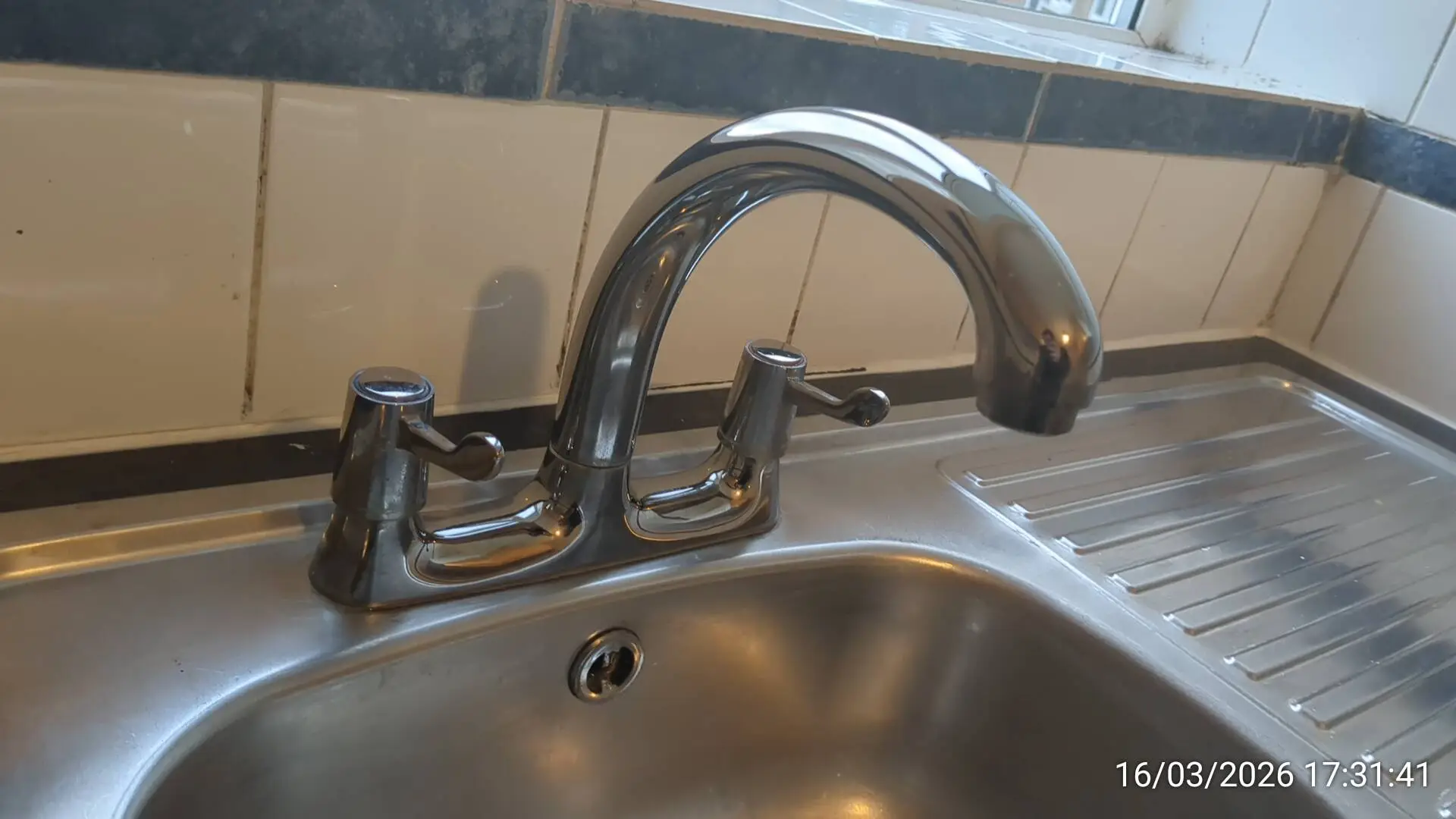 Kitchen mixer tap and drainer documented in close-up during an inventory inspection, noting condition of chrome finish.