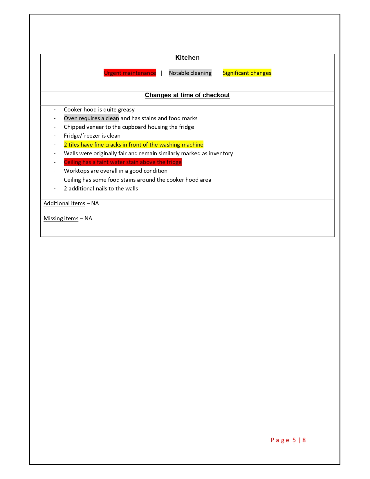 An example check-out report page showing detailed findings — colour-coded for urgent maintenance, notable cleaning, and significant changes.